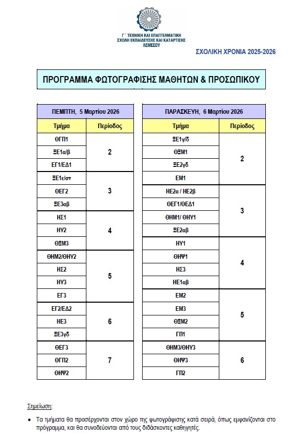 Η φωτογράφιση θα γίνει τη Πέμπτη, 5 Μαρτίου και τη Παρασκευή, 6 Μαρτίου 2026