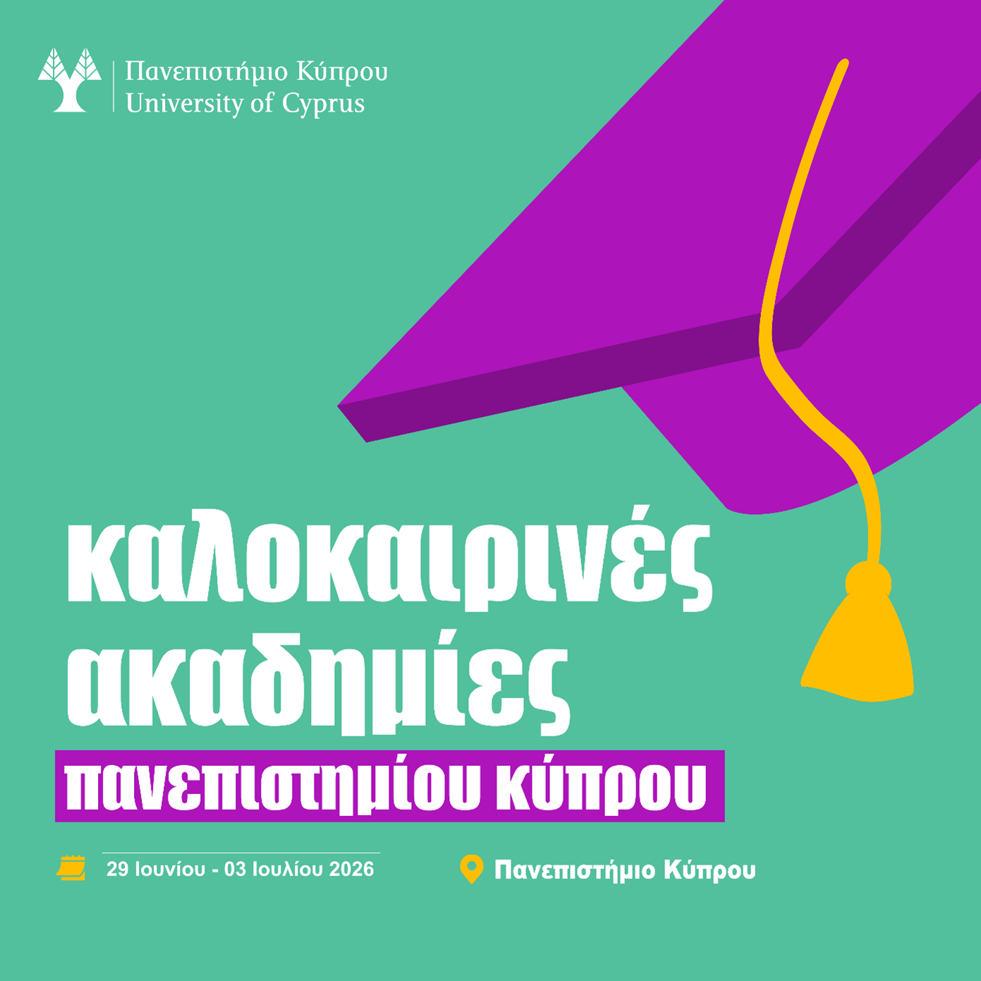 Το Πανεπιστήμιο Κύπρου διοργανώνει και φέτος Καλοκαιρινές Ακαδημίες για μαθητές και μαθήτριες ηλικίας 14-18 ετών, διάρκειας μιας βδομάδας, την περίοδο από 29 Ιουνίου έως και 3 Ιουλίου 2026. Οι εν λόγω Ακαδημίες προσφέρουν μια μοναδική ευκαιρία για να γνωρίσουν οι ενδιαφερόμενοι/νες τα Επιστημονικά Πεδία και τα επαγγέλματα που τους ενδιαφέρουν με ένα διαθεματικό και διαδραστικό τρόπο στις ακόλουθες Ακαδημίες: